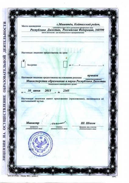 Адрес местонахождения образовательной организации* 368596, Республика Дагестан, Кайтагский район, с.Машатди, ул.Школьная 21.